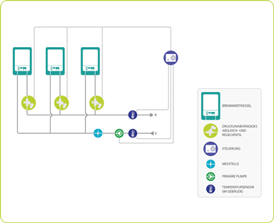 Die vollregulierenden Kessel sind mit der Steuerung verbunden, die den Durchfluss durch jeden Boiler durch das PICV kontrolliert.